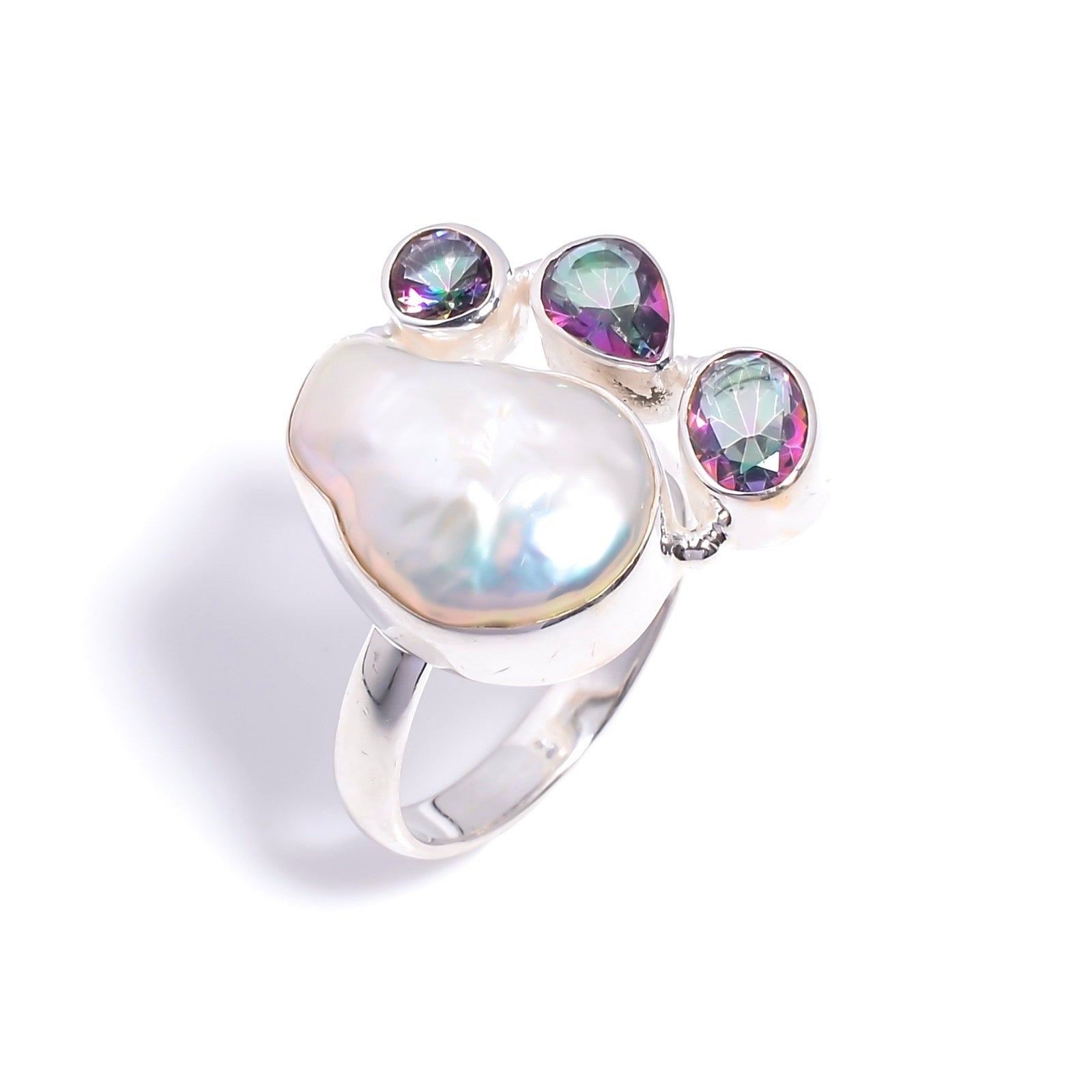 Gorgeous Baroque Pearl X Mystic Topaz Ring made with Sterling Silver 925